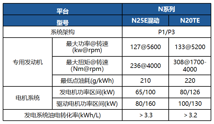 基于N系列發(fā)動(dòng)機(jī)開發(fā)的適配增程混動(dòng)車型,最大輸出功率130kW;適用于B級(jí)轎車、中大型SUV、皮卡等車型。技術(shù)特點(diǎn)